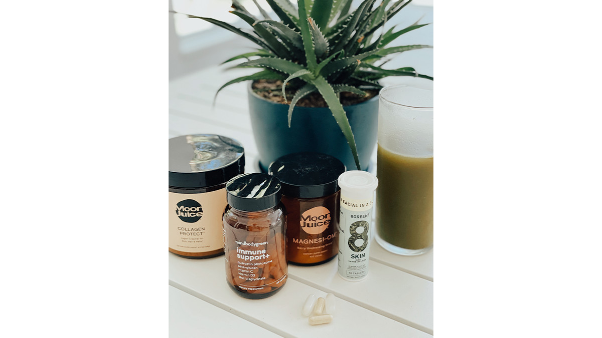 IT TOOK ME A WHILE TO FIND THE RIGHT COMBINATION OF SUPPLEMENTS THAT GIVE MY BODY WHAT IT NEEDS. I HAD SOME THAT I TOOK PRE-PREGNANCY, A DIFFERENT BUNCH FOR PRENATAL, AND NEW ONES, POSTNATAL. I'VE SPOKEN A LOT ABOUT THE CHANGES I EXPERIENCED WITH MY HAIR DURING AND AFTER MY PREGNANCY. COLLAGEN POWDER HAS HELPED SO MUCH TO BRING MY HAIR BACK TO LIFE. MAGNESIUM IS ONE OF MY FAVORITES, TAKEN EITHER DAYTIME OR BEFORE BED. IT HELPS TO CALM AND RELAX ME, AND IS ALSO SO GREAT FOR DIGESTION. TAKING IMMUNE SUPPORT SUPPLEMENTS IS GOOD FOR KEEPING MY BODY'S DEFENSE STRONG. AND I ALWAYS HAVE MY 8 GREENS ON HAND. IT GIVES ME A GOOD BOOST OF GREENS THAT STARTS MY DAY RIGHT.