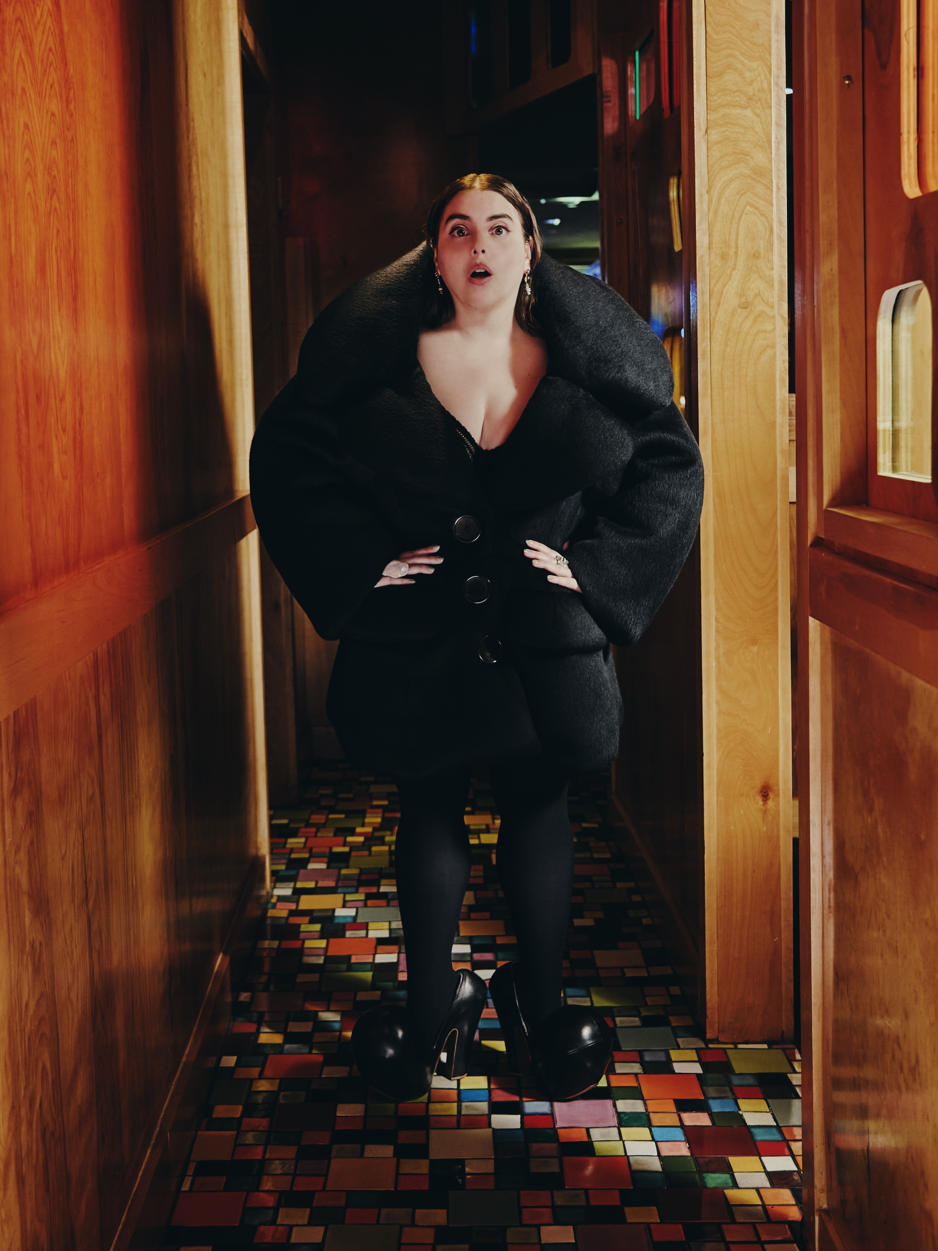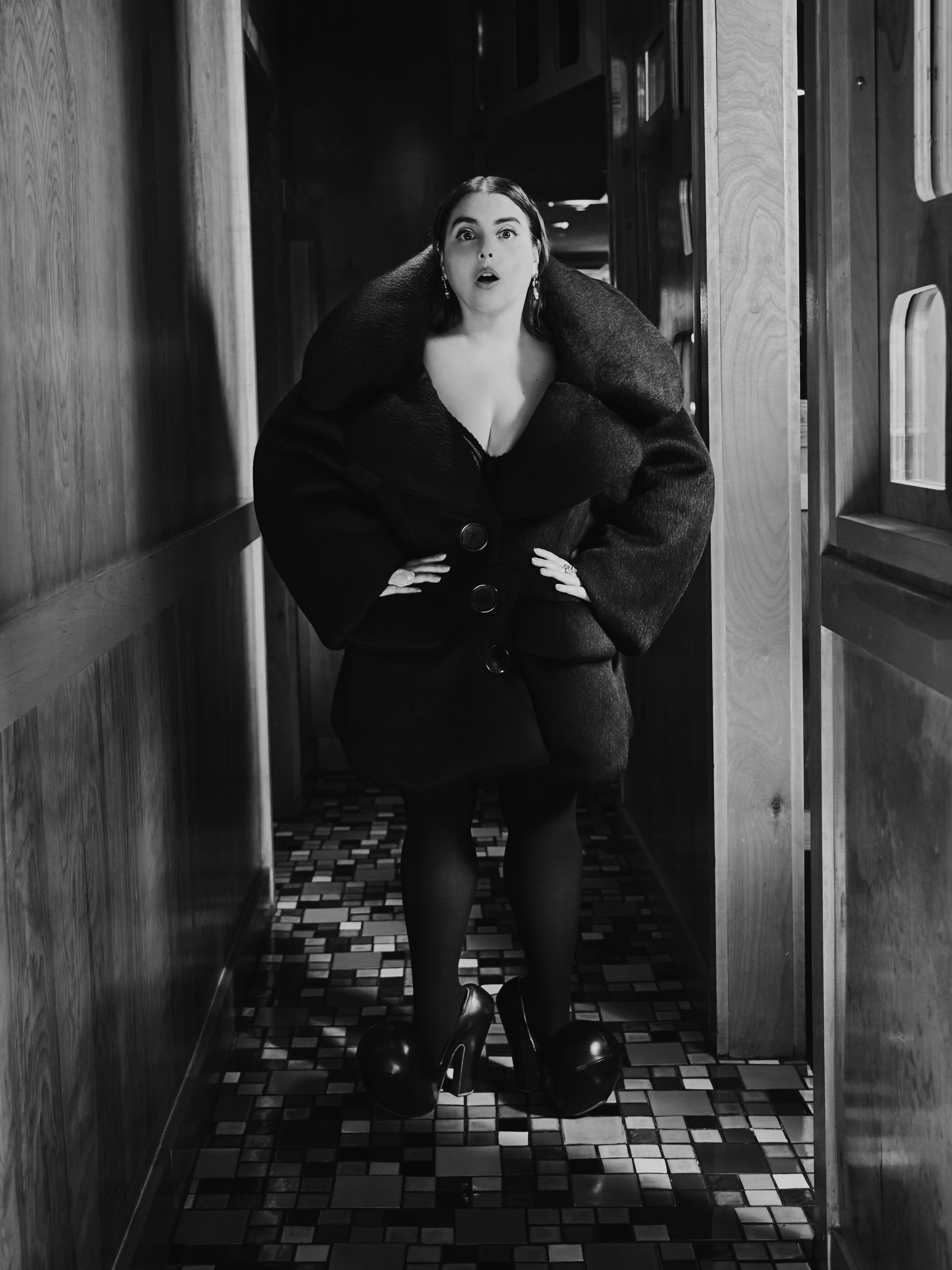 ABOVE: Michael Kors jacket, dress. Alexandre Birman shoes. THIS PHOTO: Marc Jacobs coat, skirt, shoes, Kimberly McDonald ring; Clara Chehab earrings and ring; Commando tights.