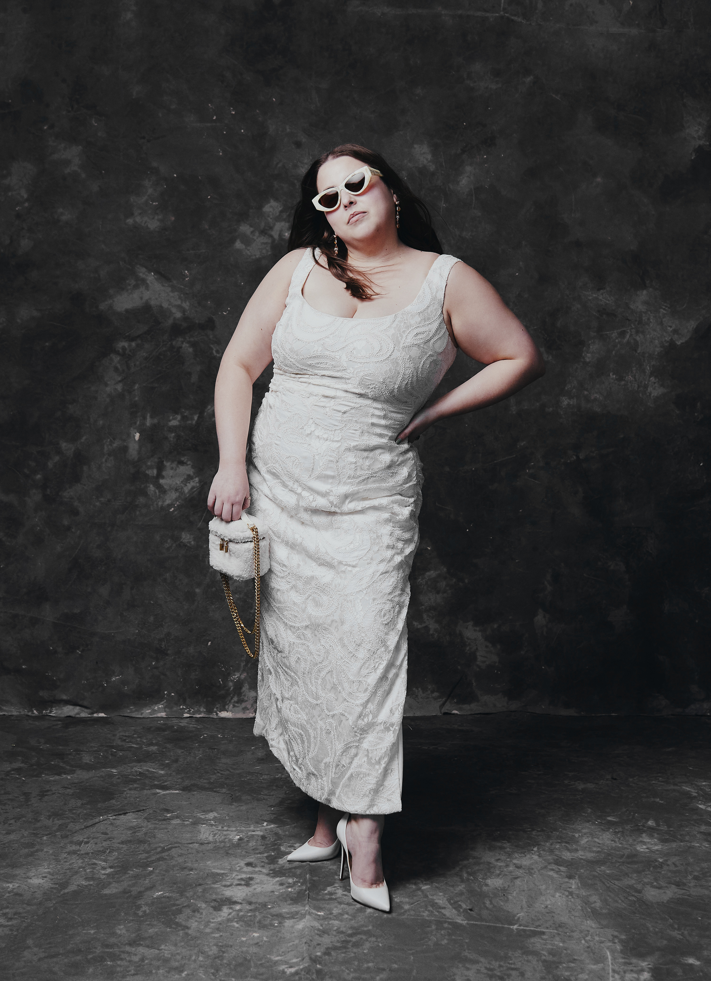 Markarian gown; NDG Paris handbag; Lowercase NYC sunglasses; Clara Chehab earrings and ring;
