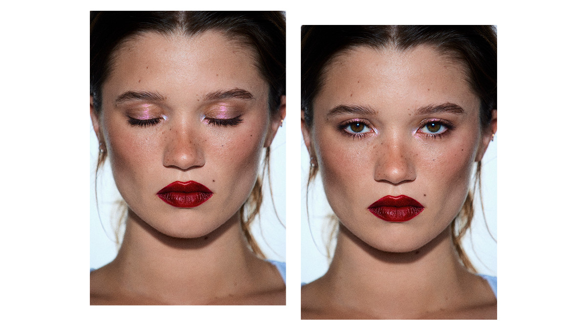 Lilly says: "This red lip and shimmering eye combination is a modern take on the classic red lip choice for holiday makeup. The bold, cherry-red lip, created with a darker, ombré effect lip liner using Gucci lipstick in Crystal Black, exudes a sense of elegance with a slight vampy vibe. It instantly elevates the look. I used a tiny amount of it on the outer lip corners, using a precise lip brush."