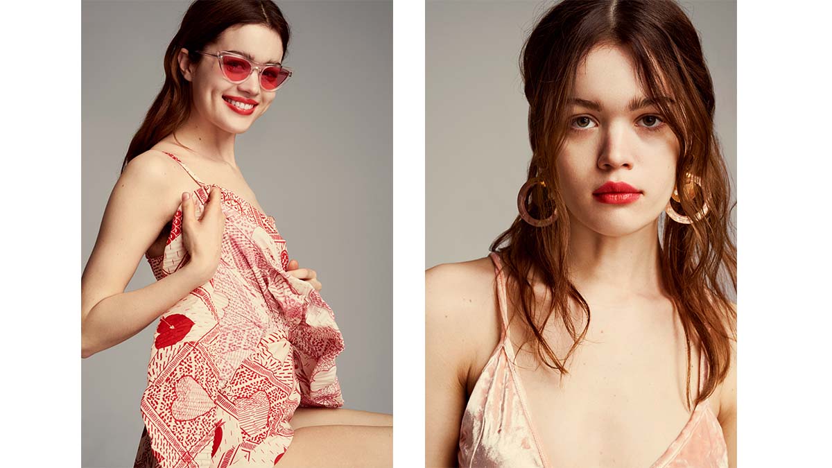 All: Yves Saint Laurent Glossy Stain Lip Color; Milk Makeup Skin Tint; Babylisspro Styling Iron; Milbon Hair Serum. Left: No. 21 Dress; Tomorrowland Camisole Dress; Oliver Peoples X Alain Mikli Sunglasses. Right: Marc Jacobs Beauty Eyeliner.