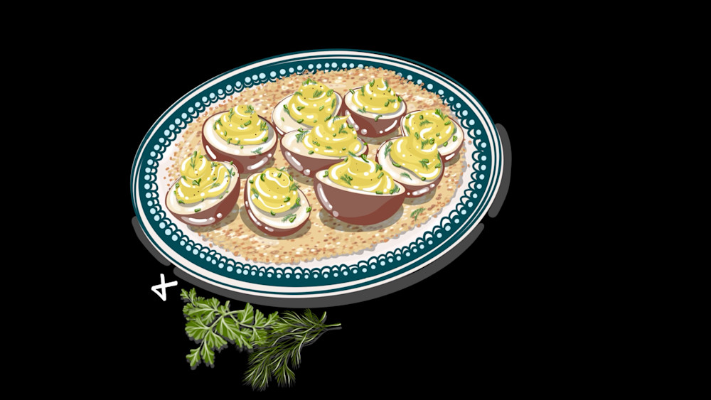 In a small pot, combine the light soy, dark soy, Sichuan peppercorns, star anise, sugar, tea bags, and one and a half cups water. Bring to a boil over medium heat, then turn the heat down, cover, and simmer for 15 minutes. Remove from the heat and let cool completely, then remove and discard the tea bags. Transfer the marinade to an airtight container. Rinse the pot, fill with fresh water, and bring to a boil. Gently lower the eggs into the boiling water and cook for 9 minutes. Transfer the eggs to a bowl of ice water to cool completely. Peel the eggs and add them to the marinade. Cover and refrigerate for thirty hours, stirring the eggs a few times to ensure the marinade coats all the eggs thoroughly. To make the panko topping, heat the olive oil in a medium skillet over medium heat until shimmering. Add the panko and smoked paprika and toast, stirring frequently, until golden brown, about five minutes. Stir in the herbs, season with salt and pepper, then transfer to a plate and spread out to let cool. To assemble, remove the eggs from the marinade and cut them in half, wiping the blade clean between each cut. Remove the yolks with a spoon and transfer to a small bowl. Add the mayonnaise, oyster sauce, and mustard powder and whisk until smooth. Season with salt and pepper. Use two spoons to spoon the yolk mixture back into the egg whites. To serve, spread half the toasted panko on a serving plate, then top with the deviled eggs. Sprinkle with the remaining panko and top with the nori and bonito flakes. Garnish with dill and cilantro and serve.