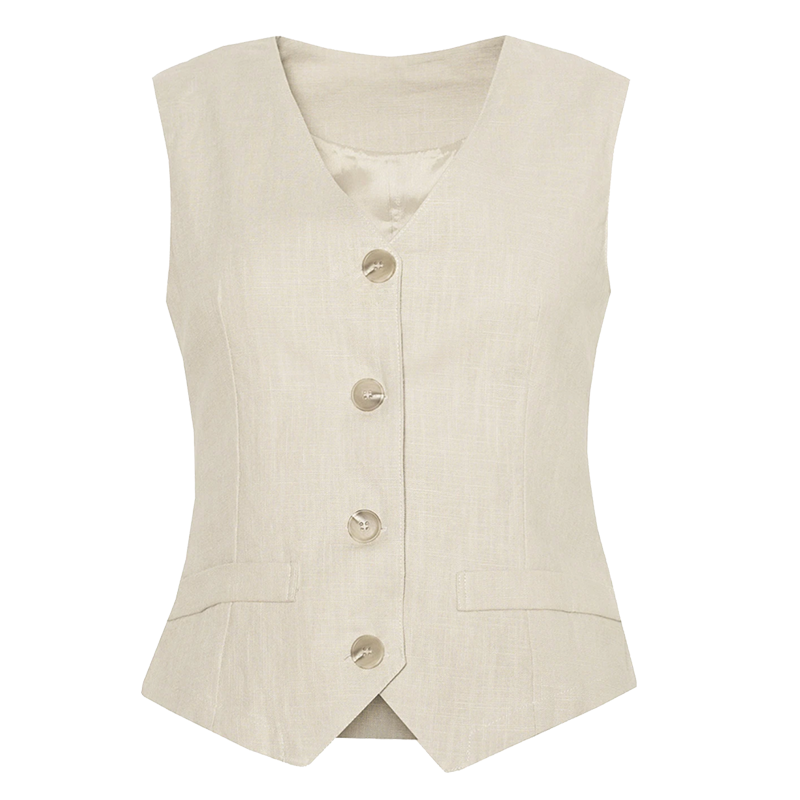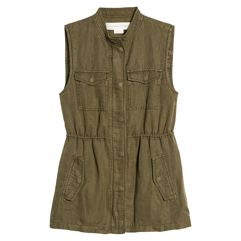 Exuding a rugged utilitarian vibe, an elongated vest in a textural linen blend features a cinched waist and plenty of pockets.