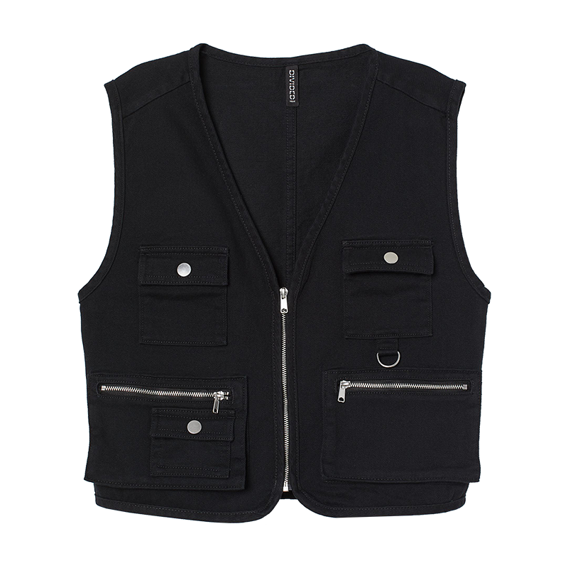 Shorter, straight-cut vest in thick cotton twill with V-neck and zipper at front. Multiple pockets and decorative D-ring at front.