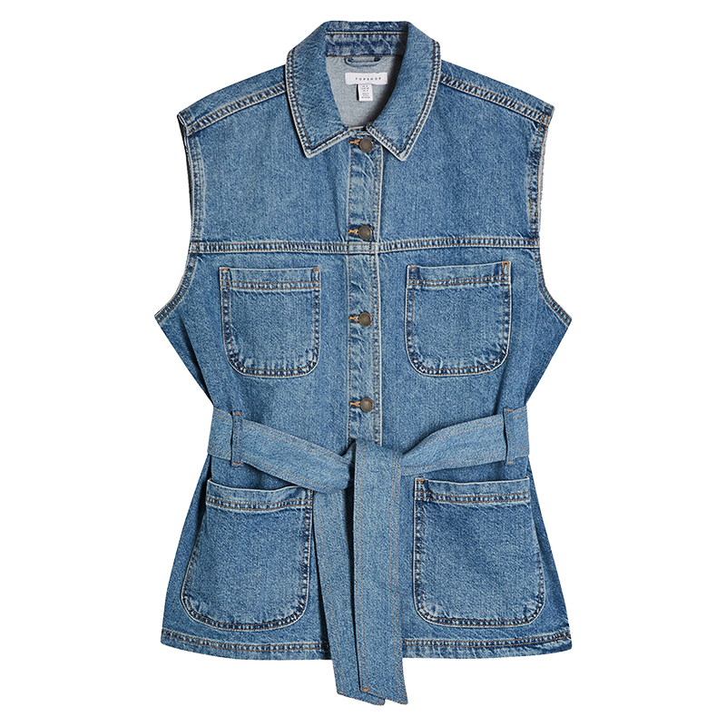 Utilitarian vest with belted waist and roomy patch pockets in medium-wash denim.