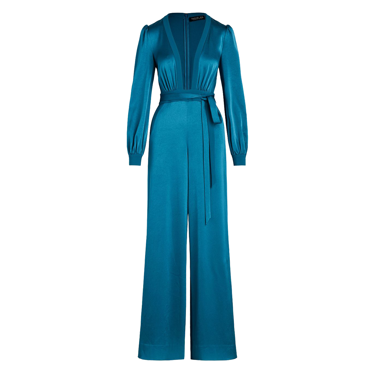 Dare to bare in the Liona jumpsuit. Cut from Rachel Zoe's beloved satin-backed crepe and featuring a plunging neckline, this jumpsuit is the epitome of easy and glamorous event dressing.