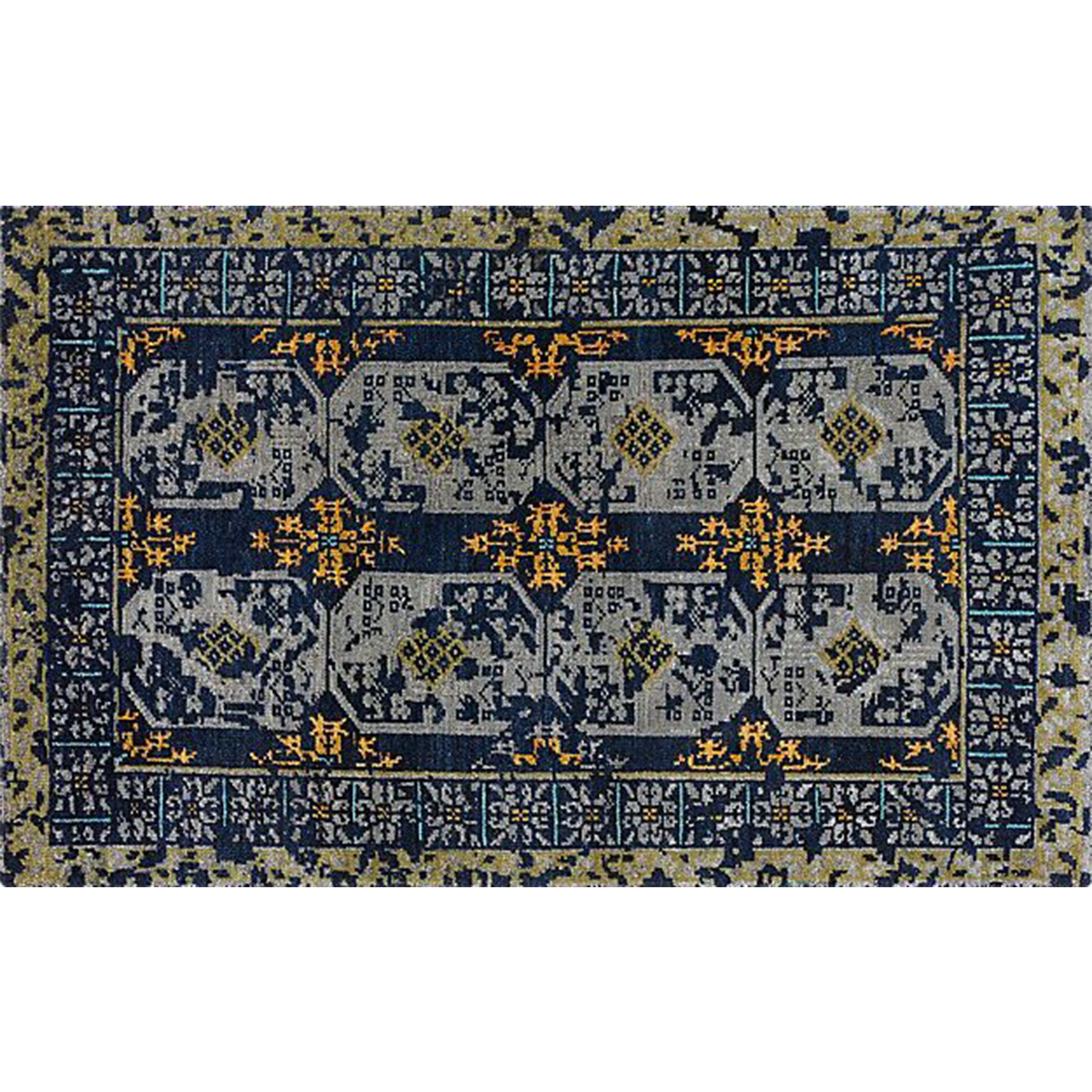 Yarn dip-dyed in deep blues/greys/greens/ambers is hand woven and hand-knotted by skilled weavers of Bhadohi. The rich kilim-like pattern is washed to create the naturally distressed look of a serious vintage find.