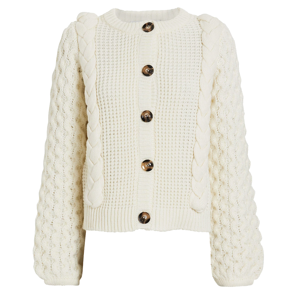 Playing off this season's novelty knit trend, the label's Kassy cardigan mixes braided appliqués and fisherman-inspired sleeves with a classic waffle pattern.