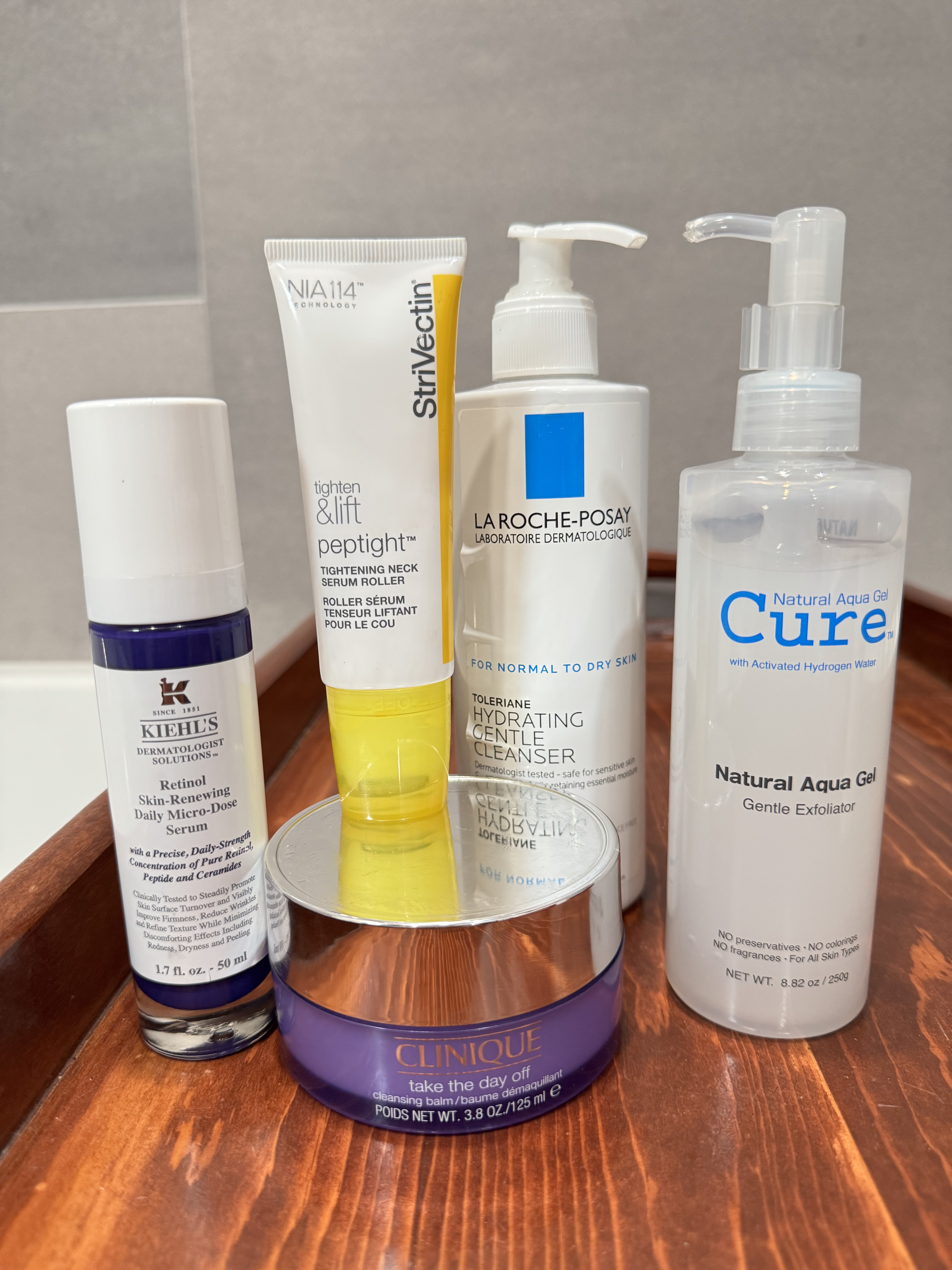 I USE CLINIQUE'S MELTING BALM TO REMOVE MY TOP LAYER OF MAKEUP, FOLLOWED BY LA ROCHE-POSAY HYDRATING CLEANSER.MAKING SURE MY FACE AND HANDS ARE DRY, I APPLY CURE AQUA GEL EXFOLIATOR AND KIEHL'S RETINOL. I FOLLOW THAT BY USING STRIVECTIN'S TIGHTENING NECK SERUM ROLLER. THIS ROUTINE IS EXFOLIATING MAGIC.