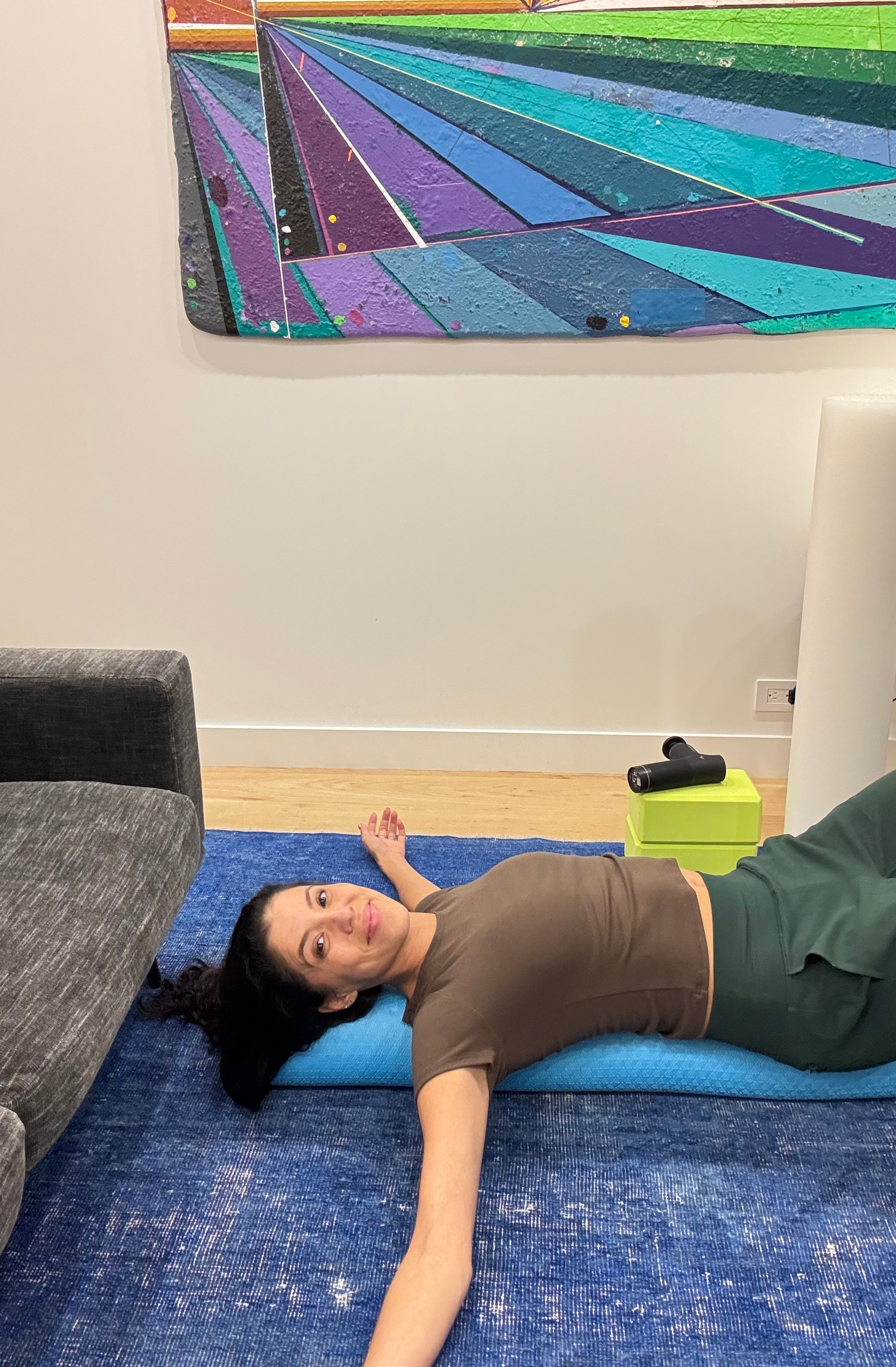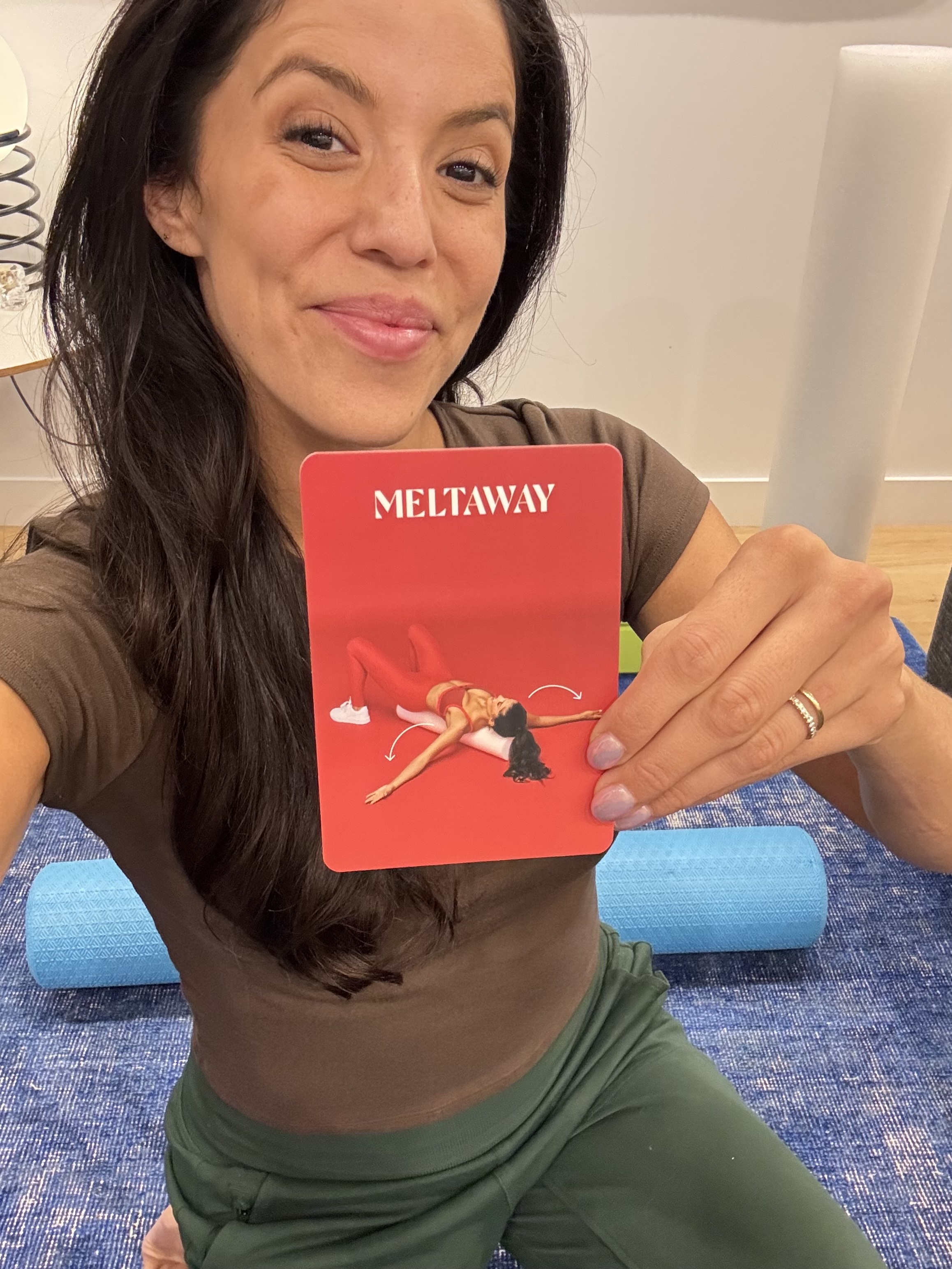 oooh...the meltaway card from my stretch deck. i could use this stretch after the last 48 hours i just had. this stretch reminds that anxiety is just a visitor, so let it come and go. as you inhale you recognize you're carrying a layer of anxiety, a layer of 'blah' in the shoulders like a little grey cloud. as you exhale and melt into the stretch, you say 'goodbye, thank you for visiting; i'm good now, I'm good where I am.' And you release and melt into a new state of calm.