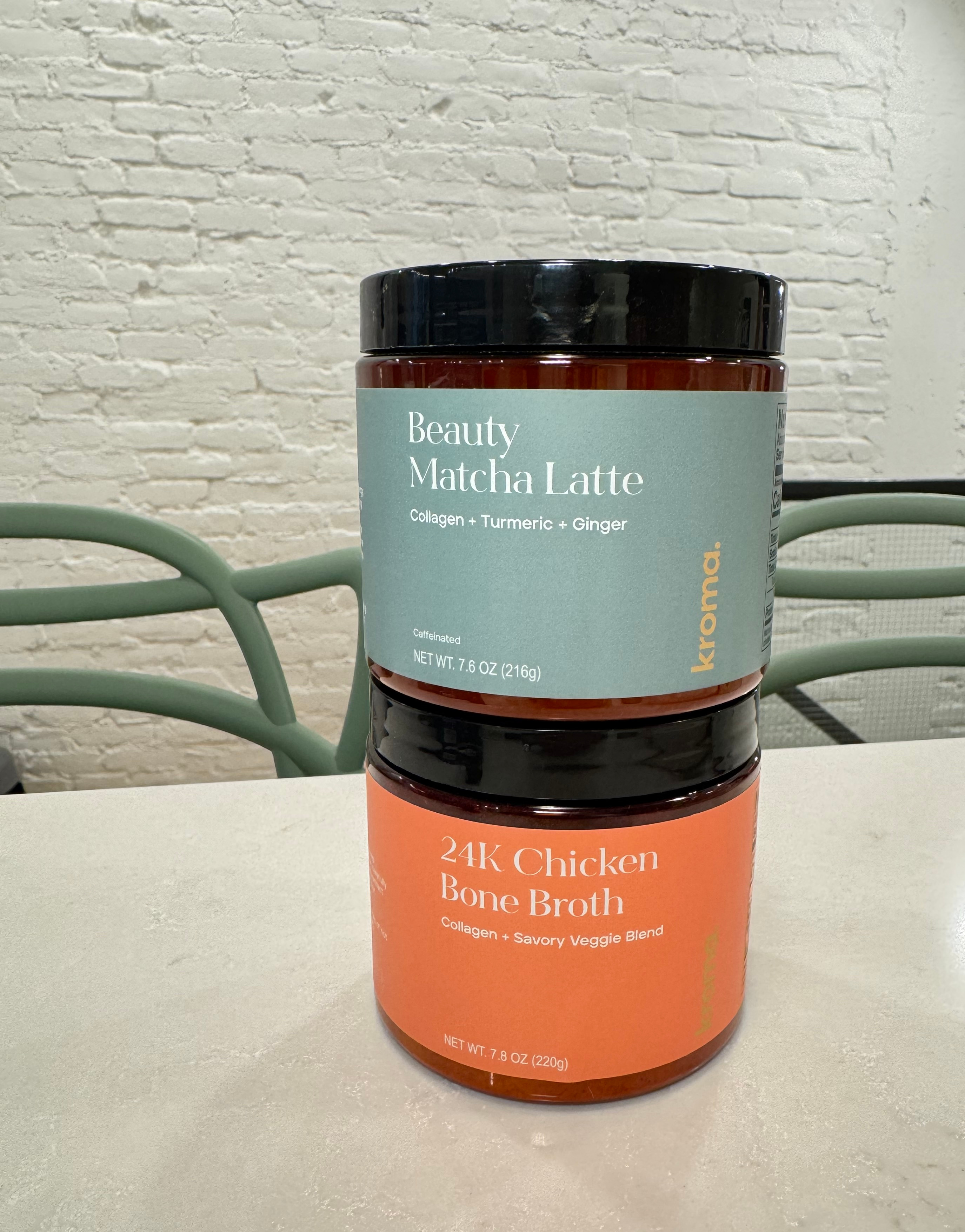 i like to keep kroma's bone broth on hand at home, but I also have some at work. you can access hot water anyway, and with one quick scoop, stir it up. it's bone broth without having to cook a bunch of ingredients together; it's bone broth without needing a refrigerator nearby, without needing to store it. it makes consuming collagen-rich bone broth a lot more doable. especially so when i'm at work, having kroma around helps me to not just grab the bag of processed whatever that I don't really want anyway. it's perfect for when I want something savory, something salty, for when I need a snack. I'm much happier making this better choice, and I usually sip on it about four times a week. i love coffee, and I still drink coffee all the time---but I also love a matcha latte. I love warm, delicious beverages, and love kroma's beauty matcha latte, which contains turmeric. I like to drink it as a late morning or afternoon treat.