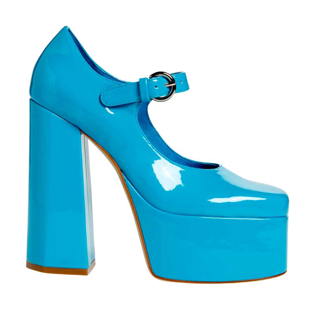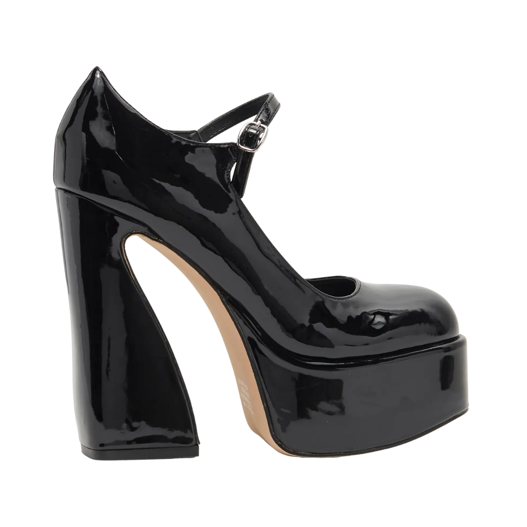 Flared-heeled, sky-high, and sleek---this pair in black patent feels plucked right off the runway.