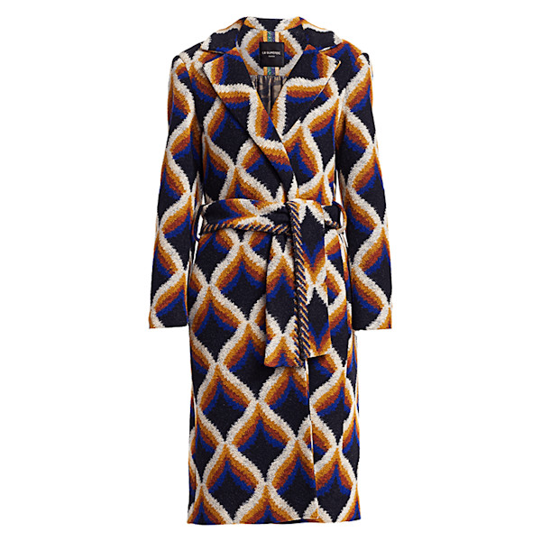 This ikat print blanket wrap coat is a showstopper with its shawl collar and deep, cozy, warm pockets. It’s like wrapping yourself in an old-fashioned blanket. And its blue tones hit just the right note.