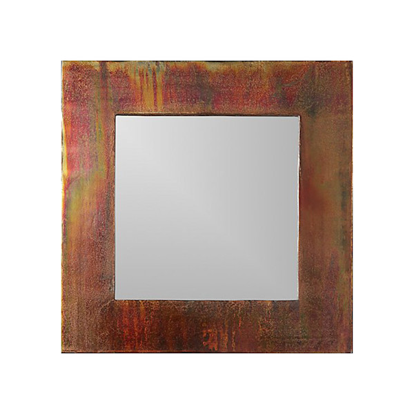 prize patina. The frame of this modern metal mirror is literally burnt to achieve a metallic rainbow effect. No two will be alike. Mix things up and hang at an angle. 24" petra antiqued square wall mirror is a CB2 exclusive. petra antiqued 24" square mirror. Glass mirror Metal frame with burnt finish Each will be unique Wipe with soft, dry cloth Clean with mirror cleaner Mounting hardware not included Made in India overall dimensions Width: 24" Depth: 2" Height: 24"