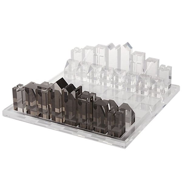 Clear and smoke grey acrylic level up this classic board game that dates from before the 7th century to modern times. Clear board with matte white grid sets the stage for healthy competition while rectangular smoke grey and clear kings, queens, rooks, bishops, knights and pawns battle it out for victory.