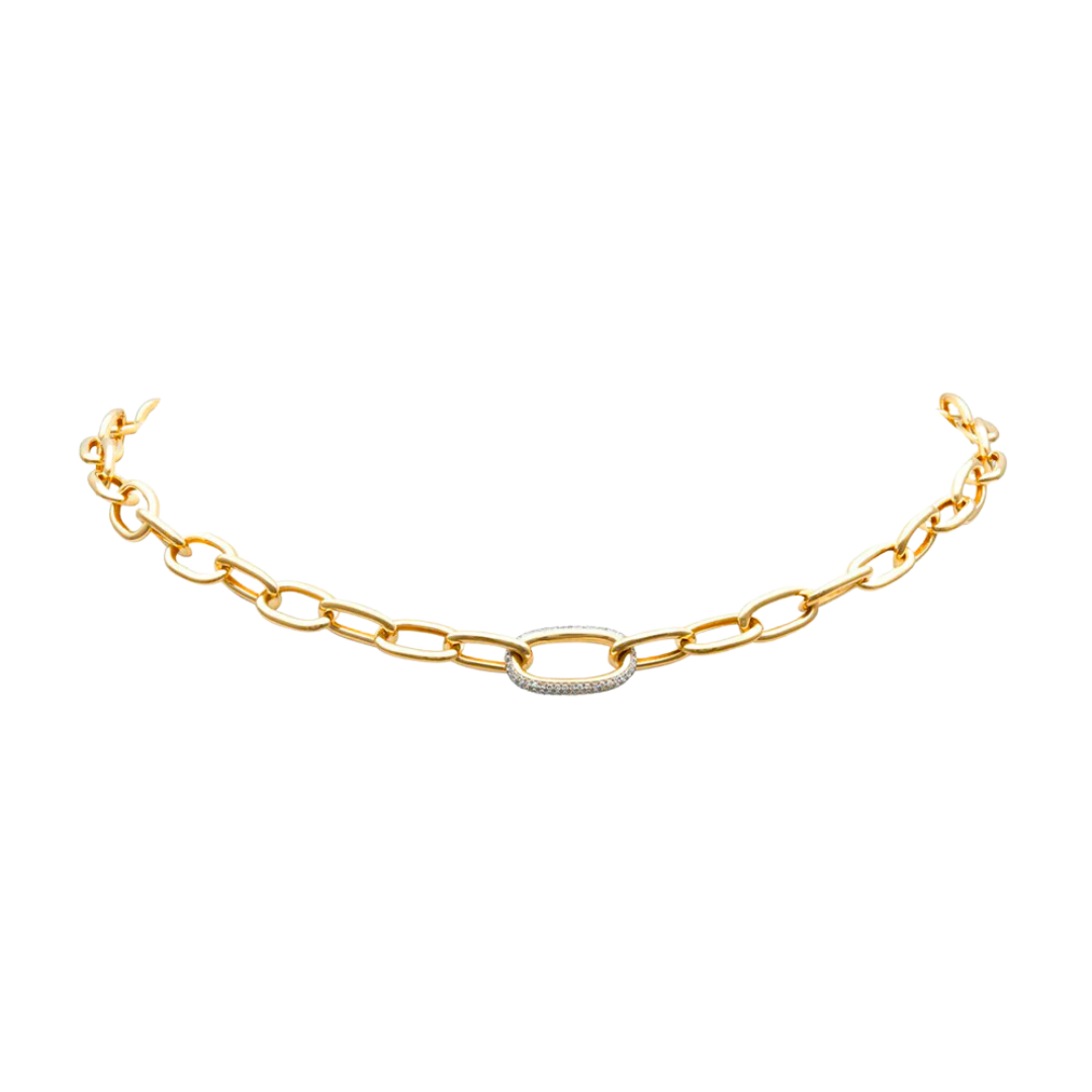 A short and bold 14k gold chain necklace decorated with a single diamond pave encrusted clasp.