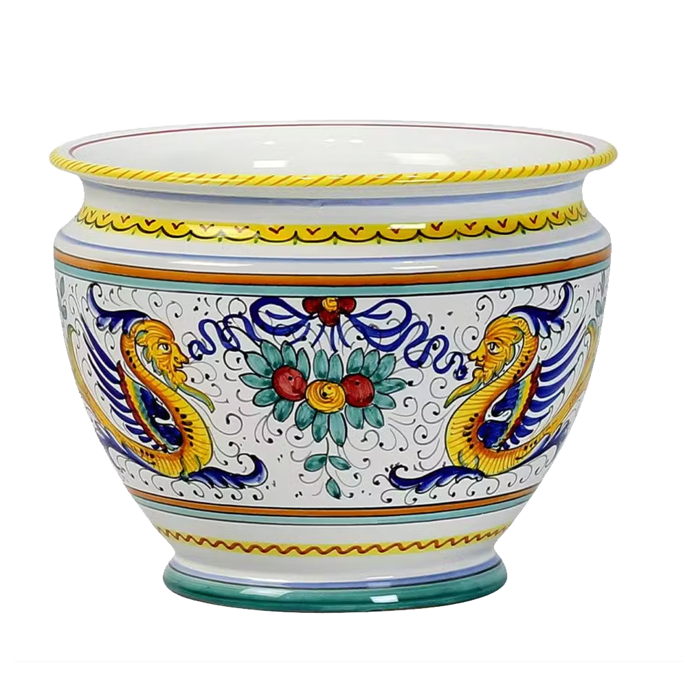 Among the most popular and enduring Italian majolica patterns, the classic 'raffaellesco' traces its origin to 16th century, and the graceful arabesques of raphael's famous frescoes. The stylized dragon of the central motif was reputedly painted first by raphael, a master painter and architect of the Italian high renaissance.100% authentic, hand painted in Italy.