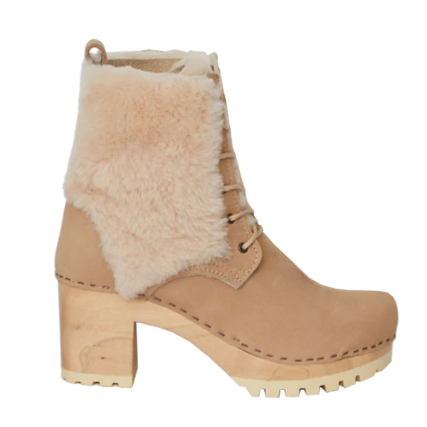 Pure as the driven snow: shearling lace up boot on slightly taller tread base for added drama. Fur-side-out tongue and 6” tall shaft. Matching nubuck toe, heel cap and back tab. Lacquered white base and lug sole for extra traction and style. Waxed cotton laces. Sheepskin lined toe and footbed.