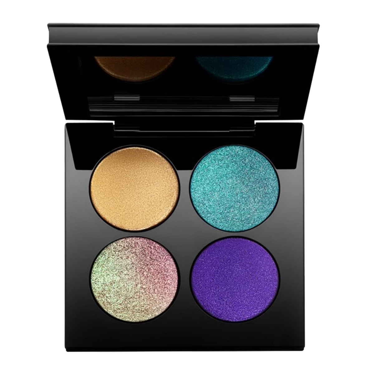 This eyeshadow quad of luxe jewel tones adorns eyes with vivid flashes of turquoise, rich purple, duochrome emerald and a diamond sparkle white gold.