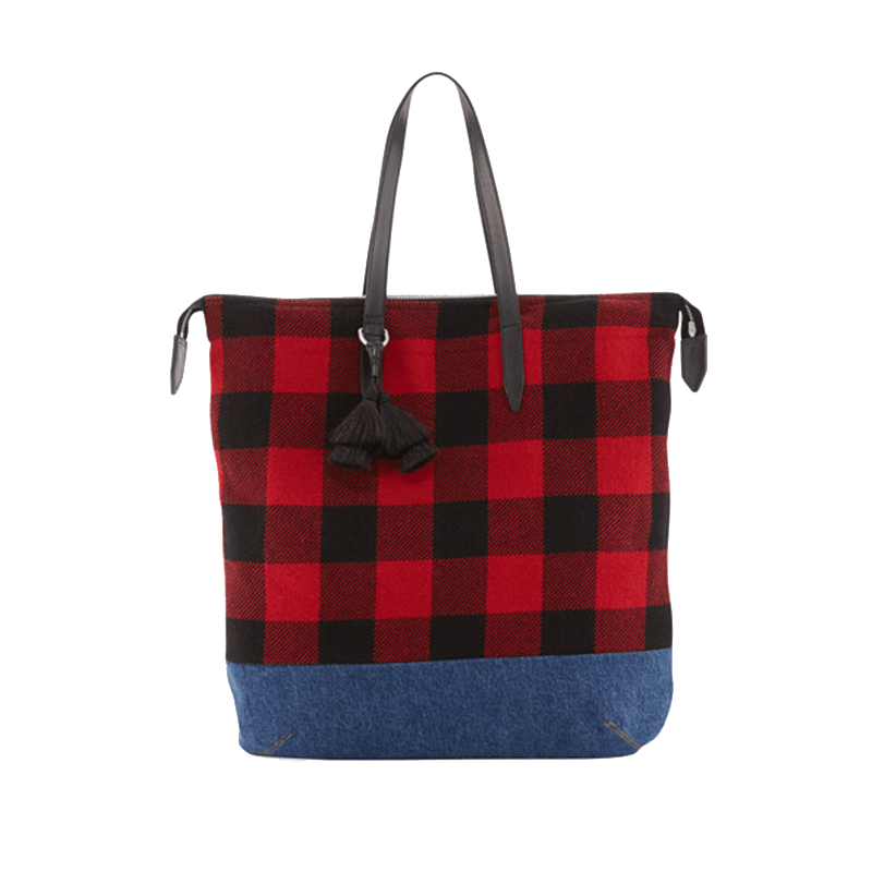 One of the most current, cool ways to wear plaid is over your shoulder. Accented with denim and leather, don’t be afraid to wear this tote with other patterns, even other plaids.