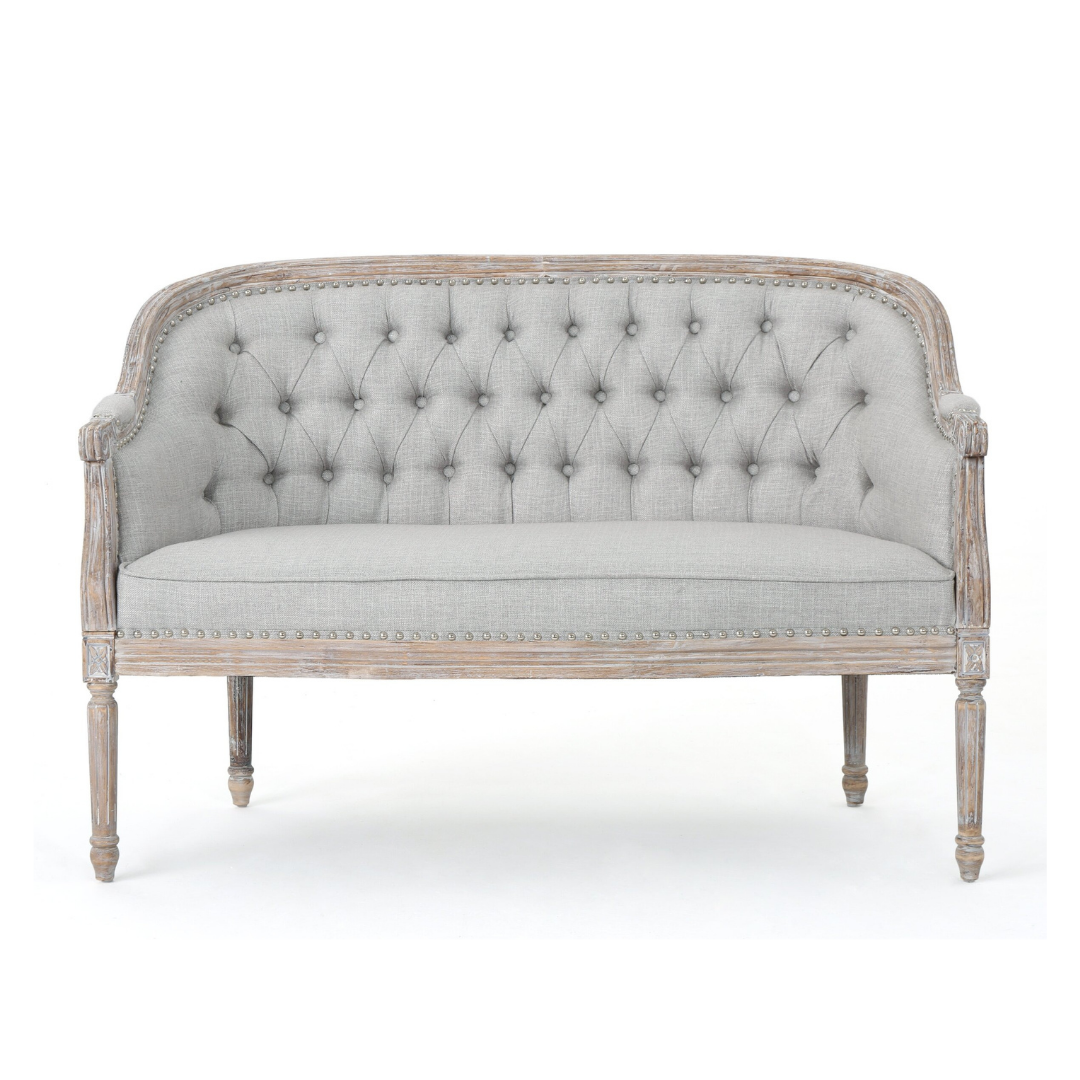Decorate your living room or bedroom in eye-catching French country style with this loveseat. It's built with a solid birch wood frame and features a cabriole-inspired silhouette thanks to its exposed frame with carved detail. The whitewash finish and straight, turned legs give this loveseat a hint of heirloom charm. The seat and back cushions are wrapped in polyester and filled with foam to provide just the right amount of support as you sit. Button tufting decorates the tight back cushion, and a nailhead trim frames the couch for a touch of vintage appeal.