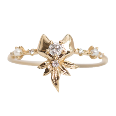 A romantic, architectural beauty. This graceful ring is an homage to the delicate filigree of movements of the Sugar Plum Fairy, her dance set to music which was meant to sound like "drops of water shooting from a fountain". 1 x 2.5mm diamond 4 x 1.0mm diamonds, 2 x 1.5mm pearls 1mm gold band made in Canada