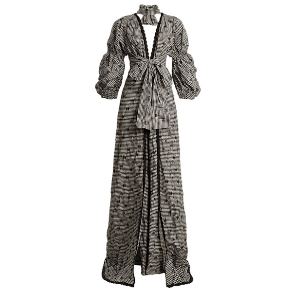 This black and white checked dress is not short on style or sophistication. The gathered waist has been intricately paneled and smocked, and features a wide self tie belt that accentuates a feminine silhouette. The balloon sleeves, and tie-knot detailing at the neck round out the wow factor.