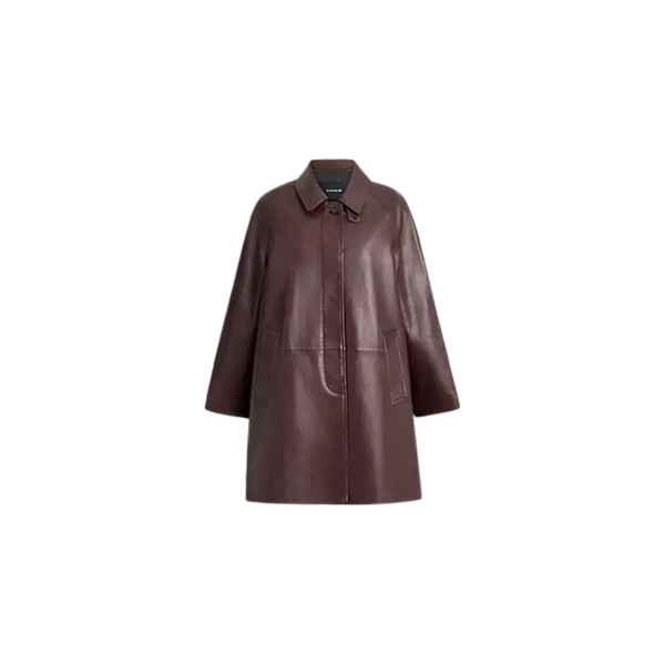 In rich Merlot, both structured and relaxed, this supple leather balmacaan is designed with raglan sleeves for easy wear. Featuring slip pockets and a concealed button placket, the fully-lined silhouette is finished with a throat latch and a back vent for ease of movement. Lamb's leather.