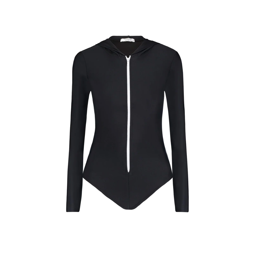 A total swim staple, Cover Swim's black hooded suit provides UV protection and pairs well with clothing.