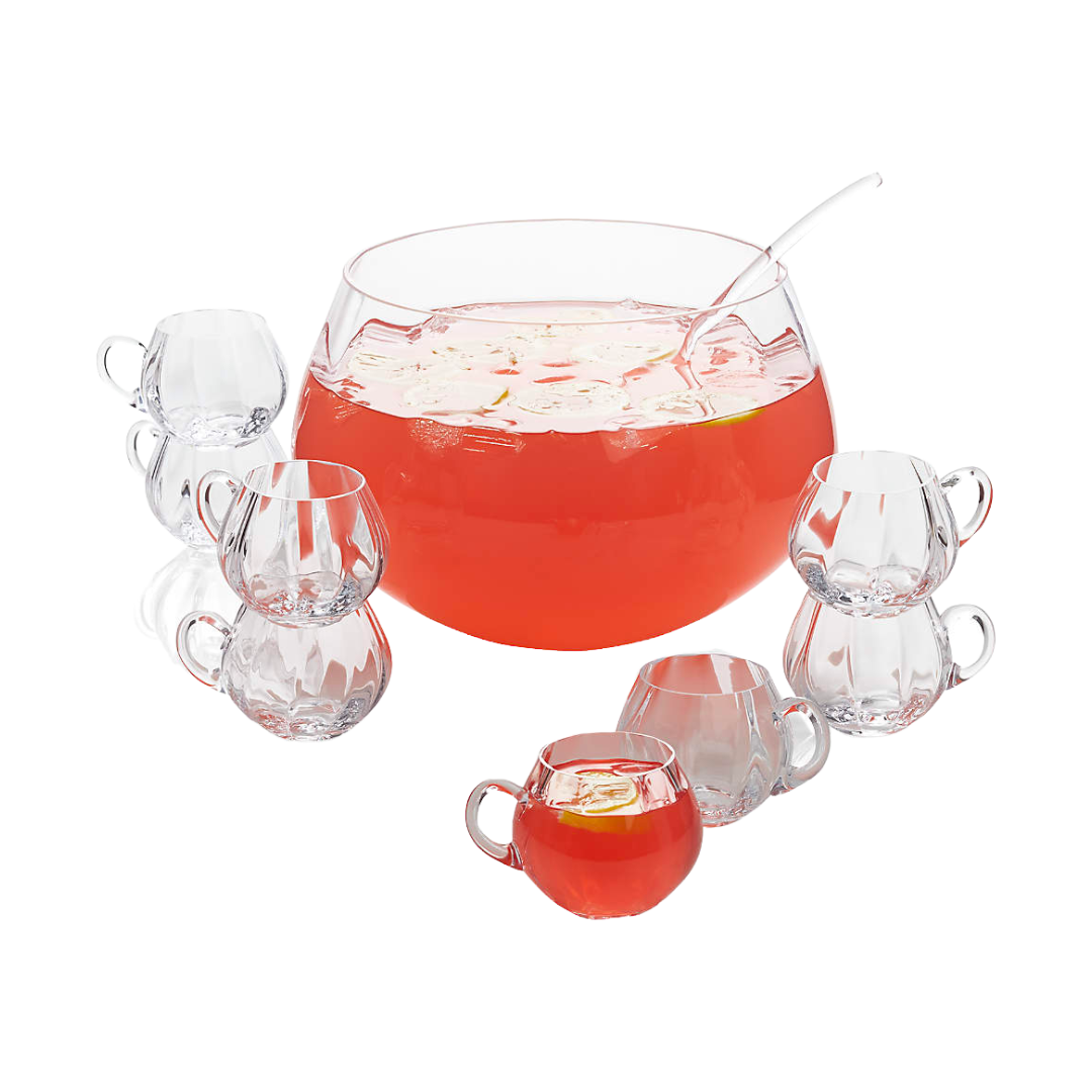 Three-gallon punch bowl, eight ten ounce cups. Old-school entertaining with a new-school optic design. Generous glass bowl features faceted sides that curve to create the low, rounded shape for ladling beverages or floating flowers and candles on table or buffet. A long, elegant glass ladle completes the set.