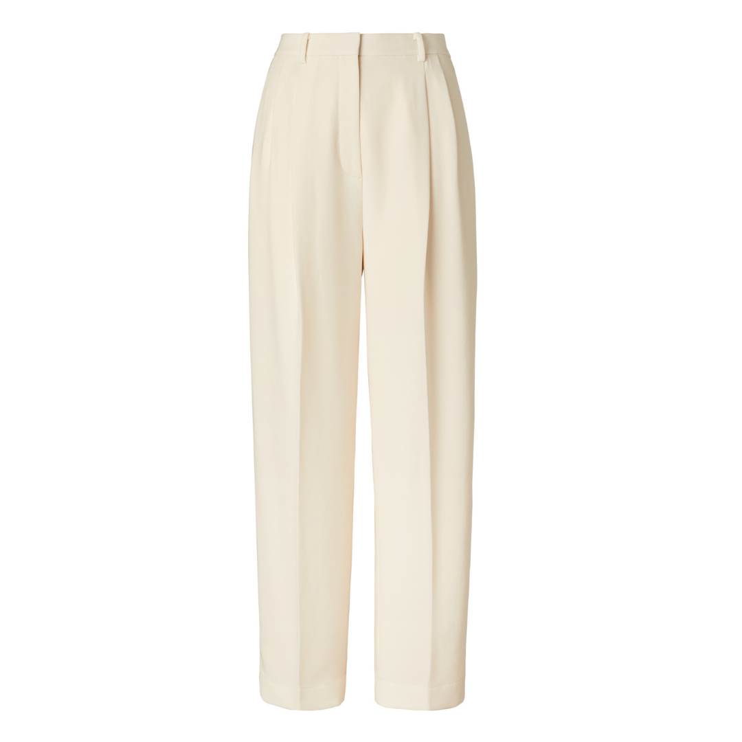 An elegant trouser in woven crepe that's easy to wear and care for. Menswear-inspired, the high-rise pant is ultra-flattering, with soft pleats and a loose straight leg. To get a tapered look, wrap sandal straps around the ankle for a gathered effect.