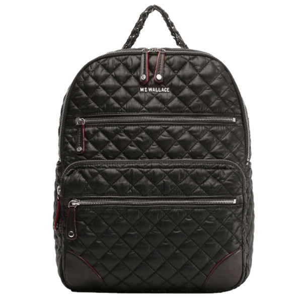 MZ Wallace's backpack has silver hardware, black leather accents, and a braided leather chain top handle. All MZ Wallace bags have genius multiple pockets. This style has three exterior zip pockets and three exterior slip pockets. The interior also has a slip pocket designed to keep clothing (or a laptop) separate.