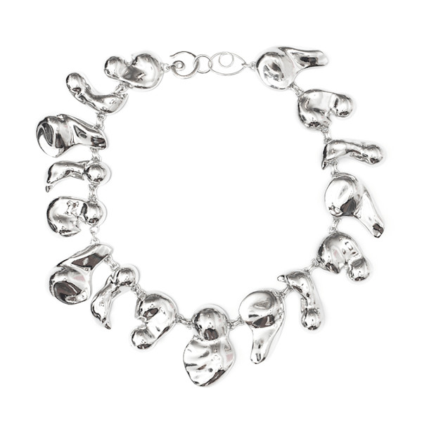 This necklace is an ode to the work of German-French sculptor Jean Hans Arp. He is known to have said “A painting or sculpture not modeled on any real object is every bit as concrete and sensuous as a leaf or a stone.” Crafted in rhodium-plated brass with a polished finish, we love the organically shaped, sculptural charms—perfect for dressing up a white button-down, an LBD, or even just a white tee.