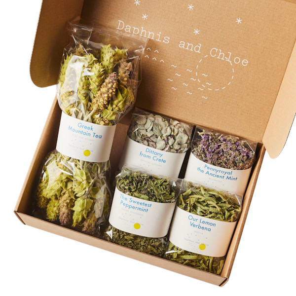 A gift set with four loose-leaf infusions, all sourced from small organic farms around Greece. Lemon verbena from the island of Samos, known for its bright green color and distinct citrus flavor. Then there are sweet pennyroyal mint blossoms, plus peppermint leaves from the foothills of Mount Minthi.The dittany from Crete has a wonderfully bitter flavor similar to thyme.
