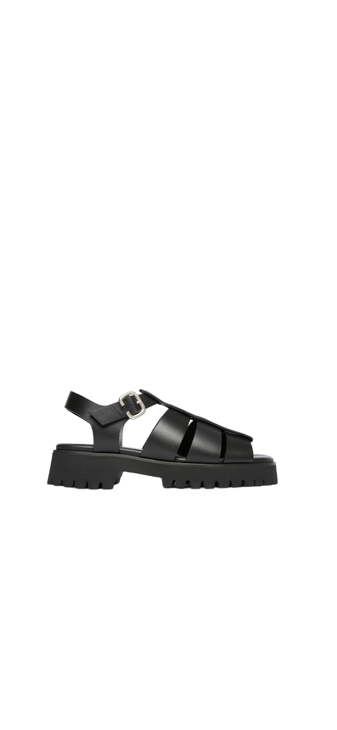 Handcrafted in the brand's black calf, Darya reimagines a fisherman style with a chunky lug sole, modern open toe and adjustable buckle. 100 percent Spanish leather lined. Tannery is a Leather Working Group Approved Trader and leather contains no PFAs.