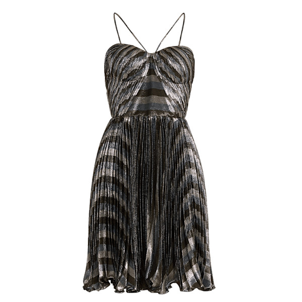If you think you may be feeling the urge to hit the dance floor, this is the dress for you! Crafted from pleated silver, grey, and blue striped lamé , this mini-dress shimmers with every twirl and swing of your hips. The bouncy, fluted hem ups the dance-ability factor and the corset style bodice has underwire cups, optional silicone padding and adjustable shoulder straps to ensure that everything stays in place.