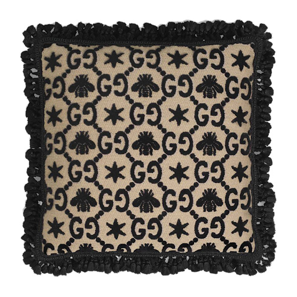The square pillow features GG pattern jacquard upholstery interspersed with bees and stars—codes that have become synonymous with the House. The design is inspired by those once used in church by English nobles and was presented as the seating during the Cruise 2016 runway show which took place in the cloisters of Westminster Abbey. Each pillow is filled by hand, sewn and edged with hand-applied braided trim and fringe tassels.