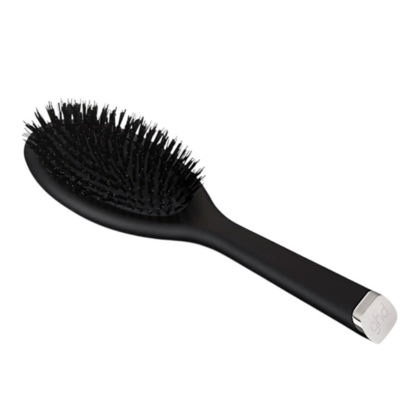 Featuring anti-static nylon bristles that penetrate hair deeper than natural bristles, distribute your hair's natural conditioning oils, and add shine as you brush. Tougher dressing bristles allow you to grip and groom your hair at the scalp and deliver the best finishing results without static. Includes a soft touch, non-slip handle, rubber cushion pad, and breathable air hole to direct air flow.