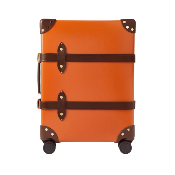 The distinctive orange colorway of Globe-Trotter's Centenary carry-on suitcase stands out against the style's classic brown leather straps and trim. The range features a marmalade orange Vulcanised Fibreboard body with classic brown leather, exquisitely finished with polished brass hardware.