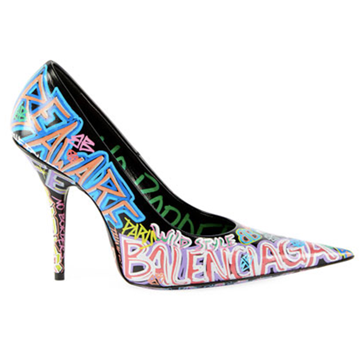 A pointed toe and ice pick heel showcase multicolored graffiti on 100% calfskin pumps. 80mm height and made in Italy