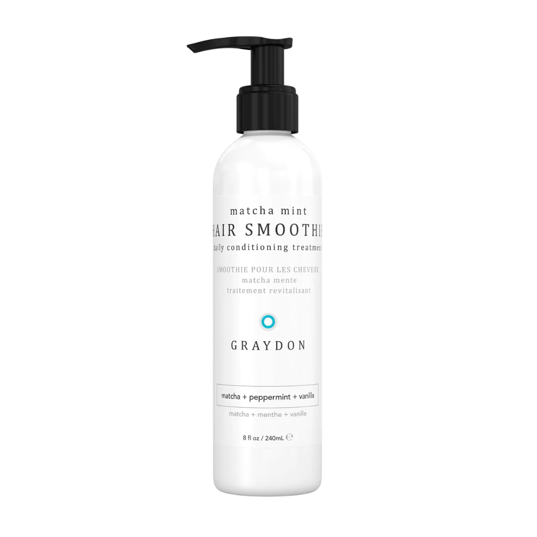 Tend to hair with Graydon's Matcha Mint Hair Smoothie. Broccoli seed oil and essential oils of parsley, sage, rosemary and thyme---all stimulate hair growth.
