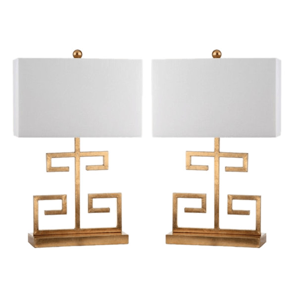 Inspired by the ancient greek symbol for infinity, each Safavieh lamp has a sleek gold metal base that becomes thoroughly modern when paired with elements of urban decor. Crisp white shades aid in bringing clean, bright light to any space. An absolutely amazing deal at $113 for both.