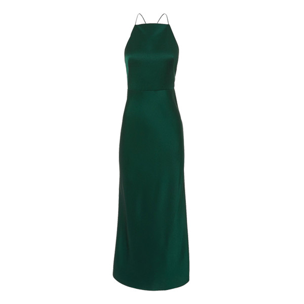You can still adhere to the black-tie directive without having your dress graze the ground. This mid-length, lustrous, satin-crepe gown is anything but simple - the adjustable crossover spaghetti straps and low back detail amplify the allure of this fitted jade showstopper. Lined in green.