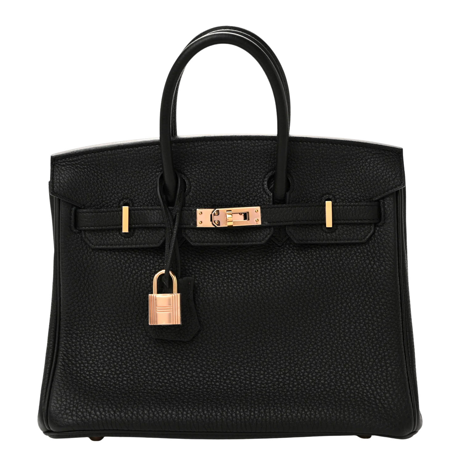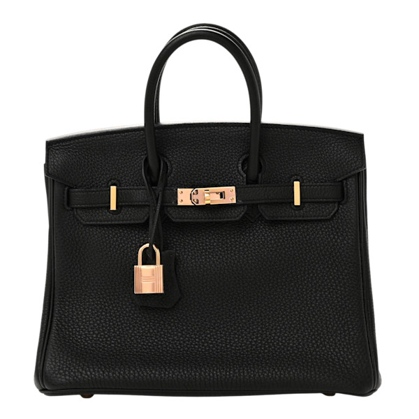 Authenticated, from 2018. This stunning Birkin handbag is crafted of textured calfskin togo leather in black. The luxurious handbag features looping leather top handles, a cross-over flap, and a strap closure with rose gold hardware links and a polished rose gold padlock including a hanging clochette with keys. The flap opens to a matching chevre leather interior with zipper and patch pockets.