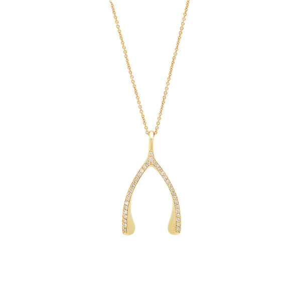Handcrafted in 18 karat yellow gold, Jennifer Meyer's signature wishbone charm is set with sparkly pavé diamonds and hangs from a delicate chain. A timeless design that is iconic to the brand (and a symbol of good luck), this necklace has the classic appeal of a wear-forever piece. Wear yours alone or layered.