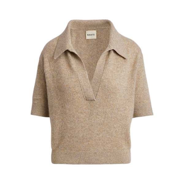 Debuting in an earthy hue for Resort 2023, this open-neck polo is a scaled-down version of the beloved Jo sweater, with a more compact collar and elbow-length sleeves. The relaxed yet feminine silhouette, with its dropped shoulder seams, highlights the plush texture of featherweight cashmere. Ribbed trim accents the neckline, cuffs, and hem.