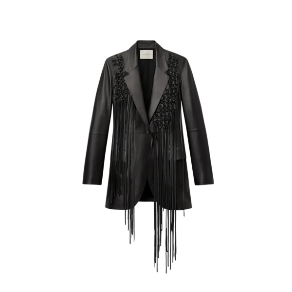 Crafted from Italian nappa leather, this single-button blazer features hand-macramé detailing and exaggerated fringing—a masterful expression of Lafayette 148's technical artistry and embellishment. The relaxed-fit design is balanced by dropped shoulders and an extended cutaway hem.