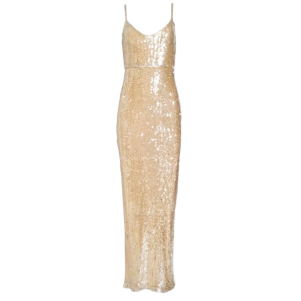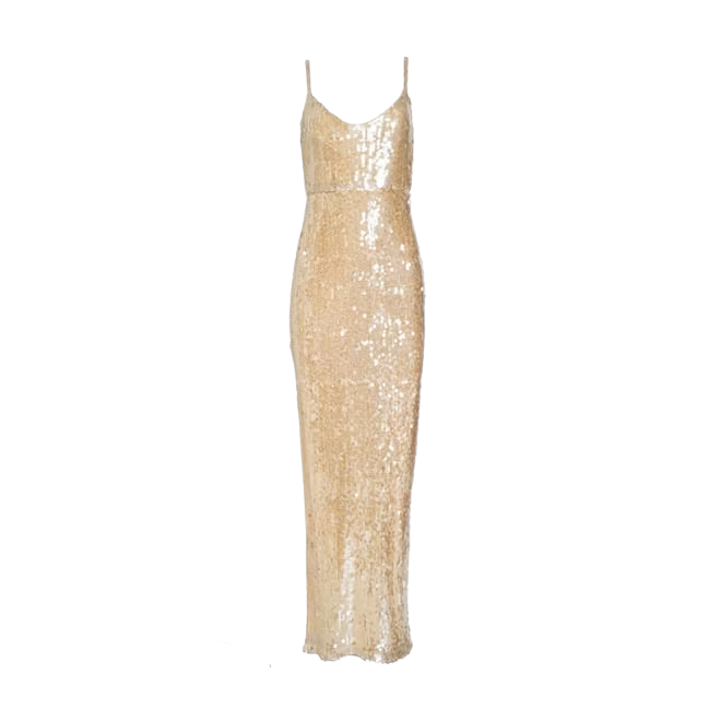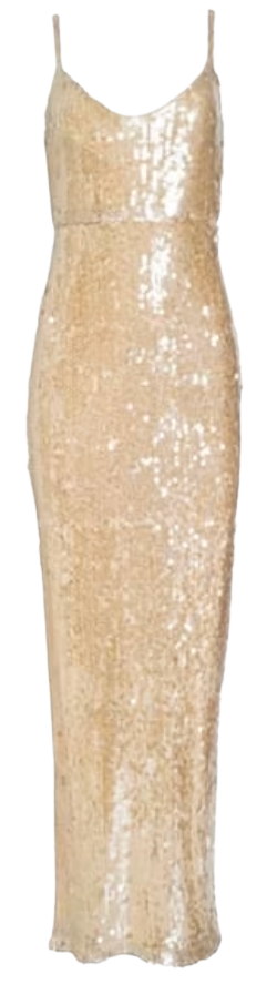 With allover sequins, L'Agence's gown shimmers with a liquid-like sheen. A structured bodice flatters the figure, and a high back slit allows for ease of movement.Clear overlapping pailletes, lined, invisible back zip. Pro tip: shorten to just below the knee for a more wearable look.