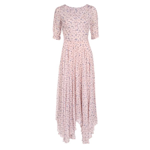 In a silk and cotton blend, Loveshack Fancy's floral dress features a flattering v-neck, ruched sleeves, fitted bodice, and handkerchief hem. Super lightweight and full of feminine detailing, we've styled it with a belted sweater. This is a piece that can be transformed and accessorized to create all sorts of looks.