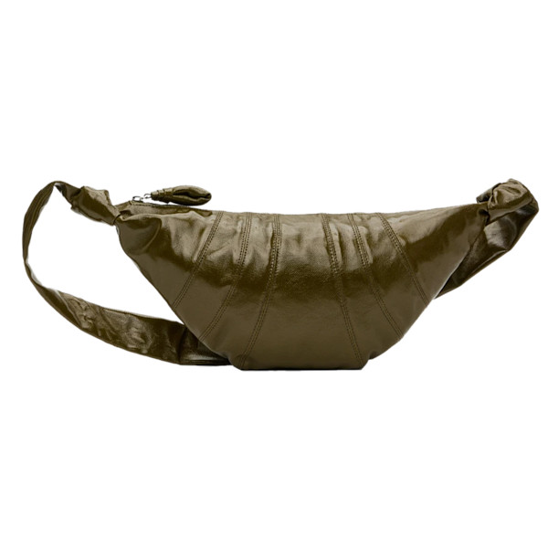 Christophe Lemaire's classic bag is made of coated cotton with a crisp texture and a shiny finish. Inspired by the shape of a croissant pastry, the bag's design is achieved through an assembly of topstitched cutouts. It features a matching looped zip puller and side knot finishings, and is worn as a shoulder or crossbody bag.